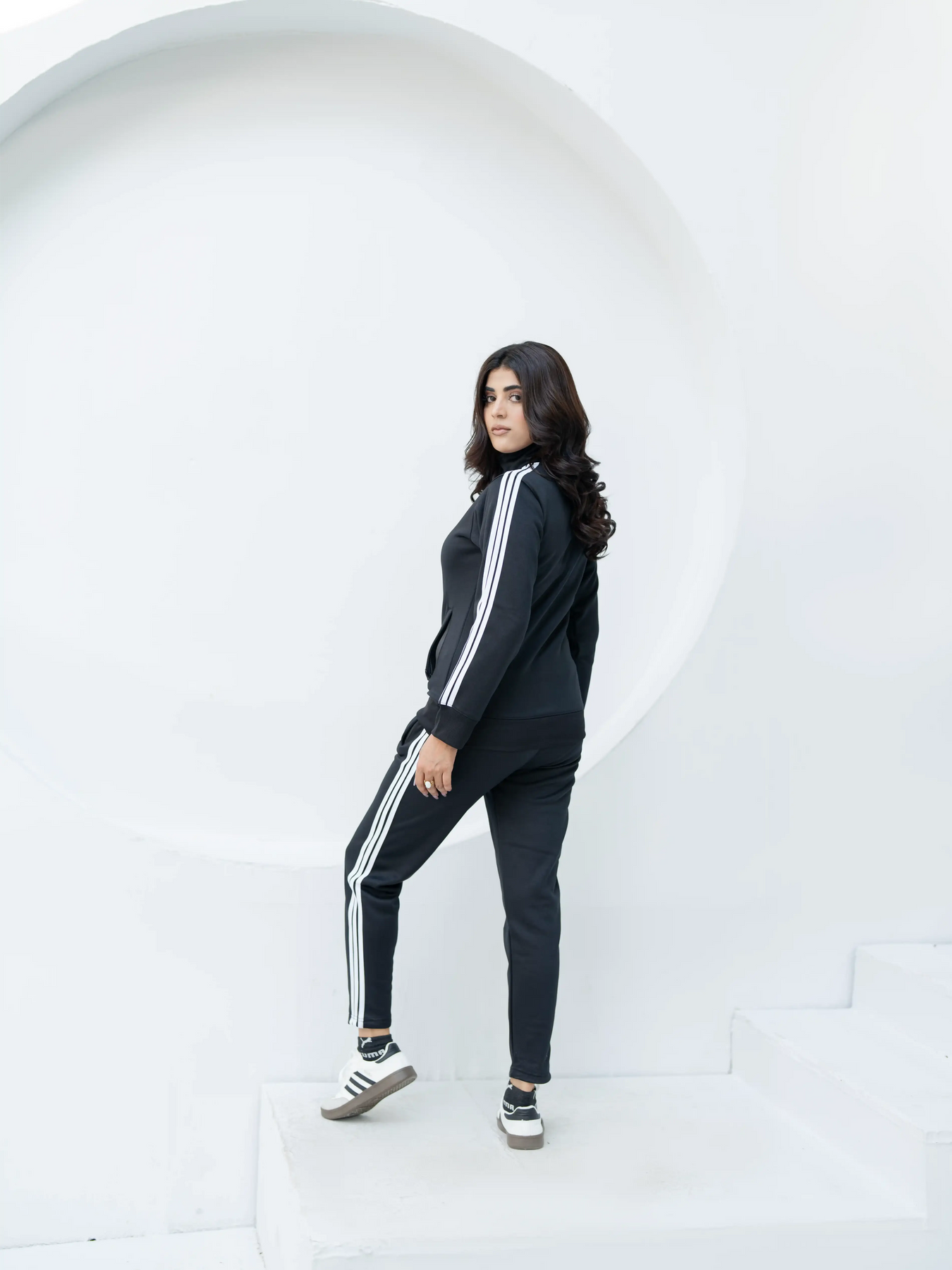 Woman wearing a black tracksuit with white stripes on a white background